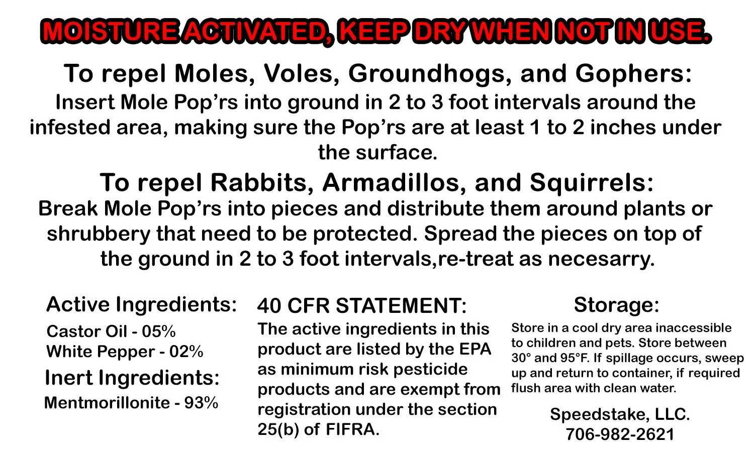 Mole Pop'rs Mole Repellent is easy and safe to use. This mole repellent features natural ingredients that are pre-mixed and molded into pellets. The Mole Pop'rs Mole Repellent is effective for up to 90 days (depending on amount of rain). Mole Pop'rs use all-natural ingredients to chase moles away. Simply pop the specially formulated pellets into the mole run at 2 to 3-ft intervals. Once activated by the moisture in the ground, the Mole Pop'rs Mole Repellent pellets release odors that make moles want to leave in a hurry! Effective for up to 90 days, the Mole Pop'rs also repel voles, groundhogs, and gophers. You can also break the pellets apart and scatter in your garden to repel rabbits, ground squirrels, and armadillos. Mole Pop'rs Mole Repellent is non-toxic and won't harm wildlife, children, or pets.